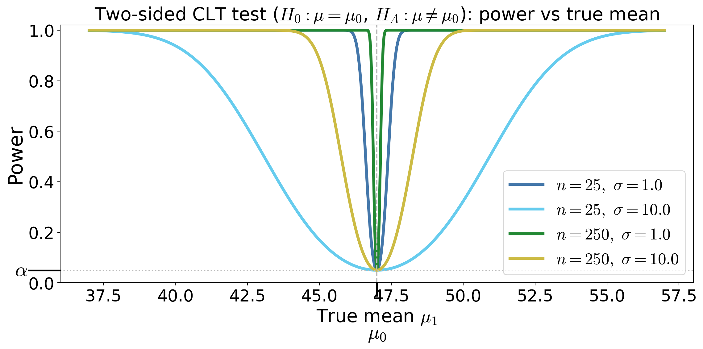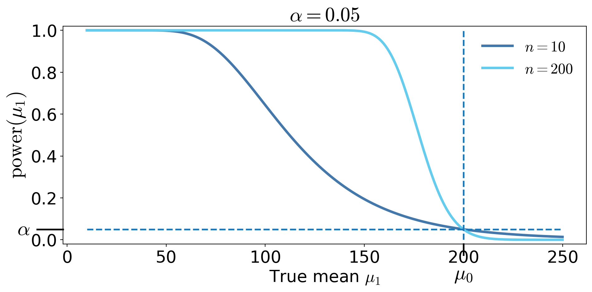 Power function — the probability of rejecting \(H_0\) when the true mean is \(\mu_1\)