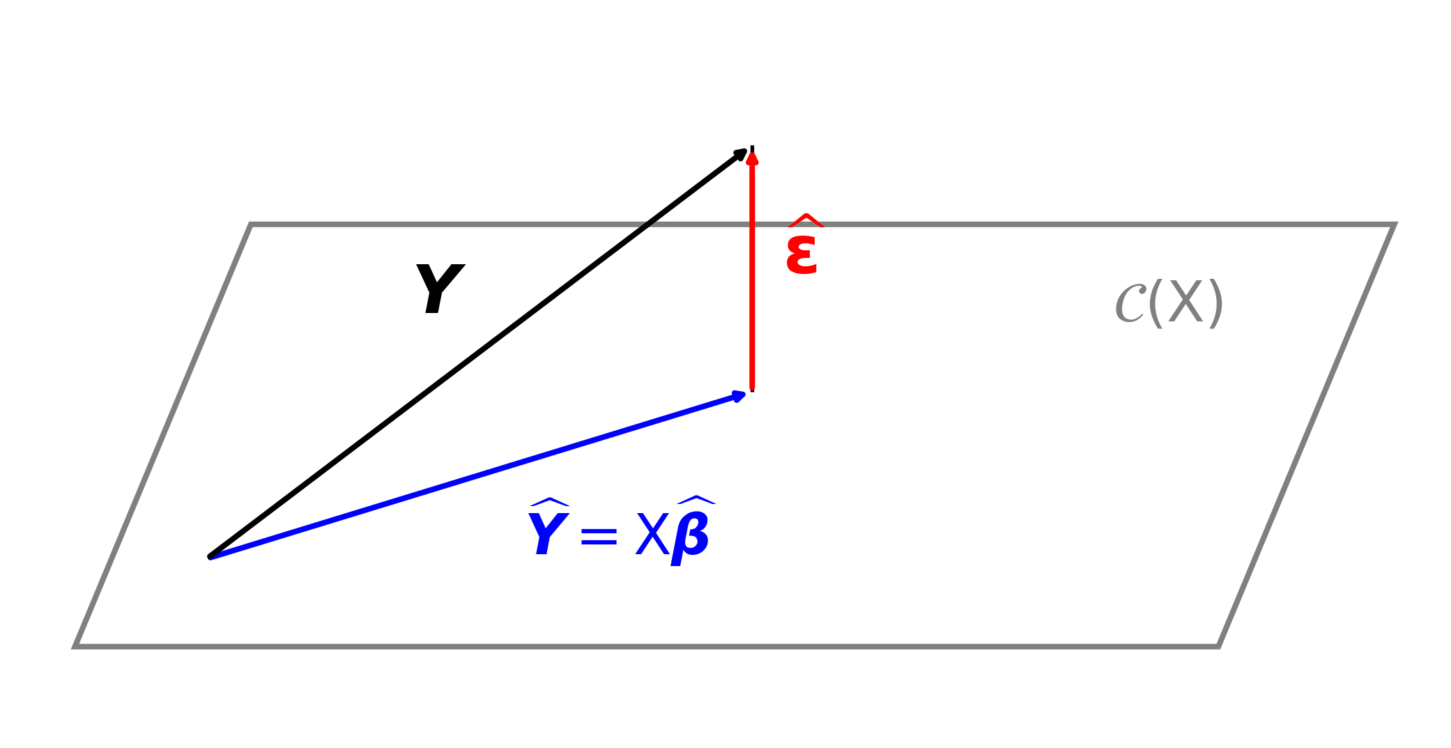 \(\hvY : = \mX \hvbeta = \underbrace{\mX (\mX^\top \mX)^{-1} \mX^\top}_{\href{https://en.wikipedia.org/wiki/Projection_matrix}{\text{projection matrix }} \mP} \vY\) is an estimator of \(\mu(\vX) = \Ex(\vY)\)