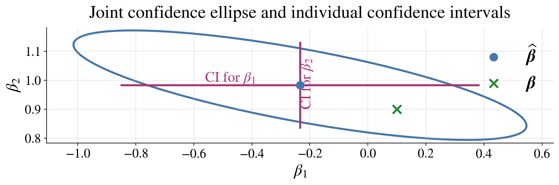 If we form separate \((1-\alpha)\) confidence intervals for each \(\beta_j\), the probability that of them are simultaneously correct is generally less than \((1-\alpha)\)