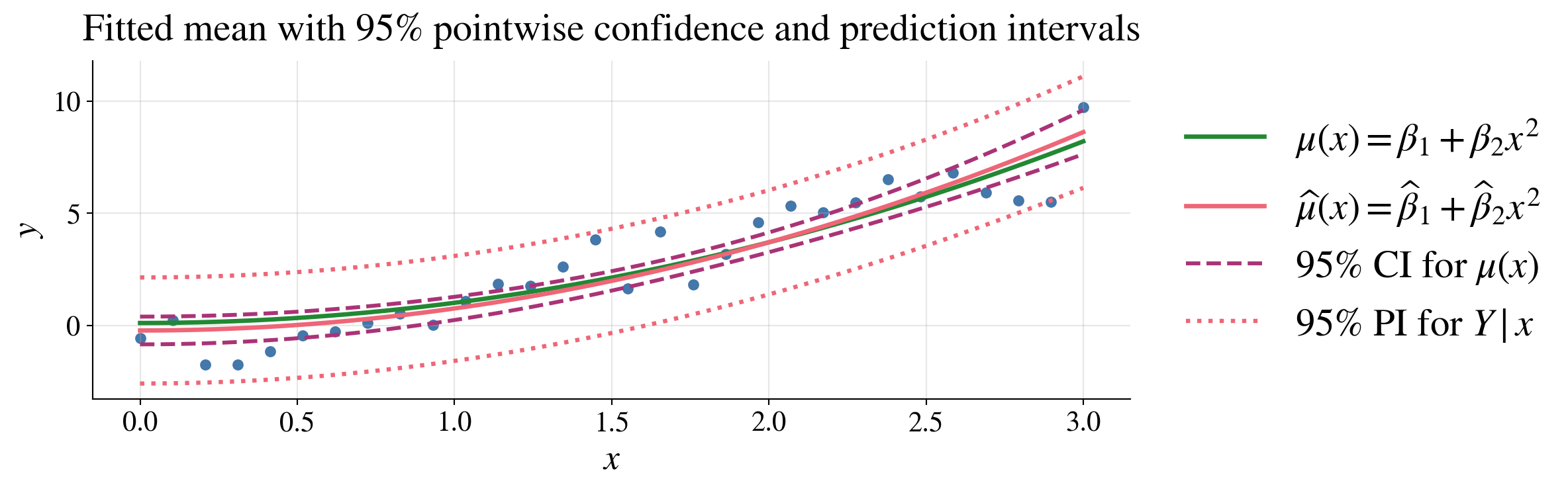 | Confidence/ prediction regions for | \(\vbeta\), \(\mu(\vx)\), \(Y \mid \vx\) | \(\mu\), \(\sigma^2\), \(p\), \(\lambda\), \(Y\) |