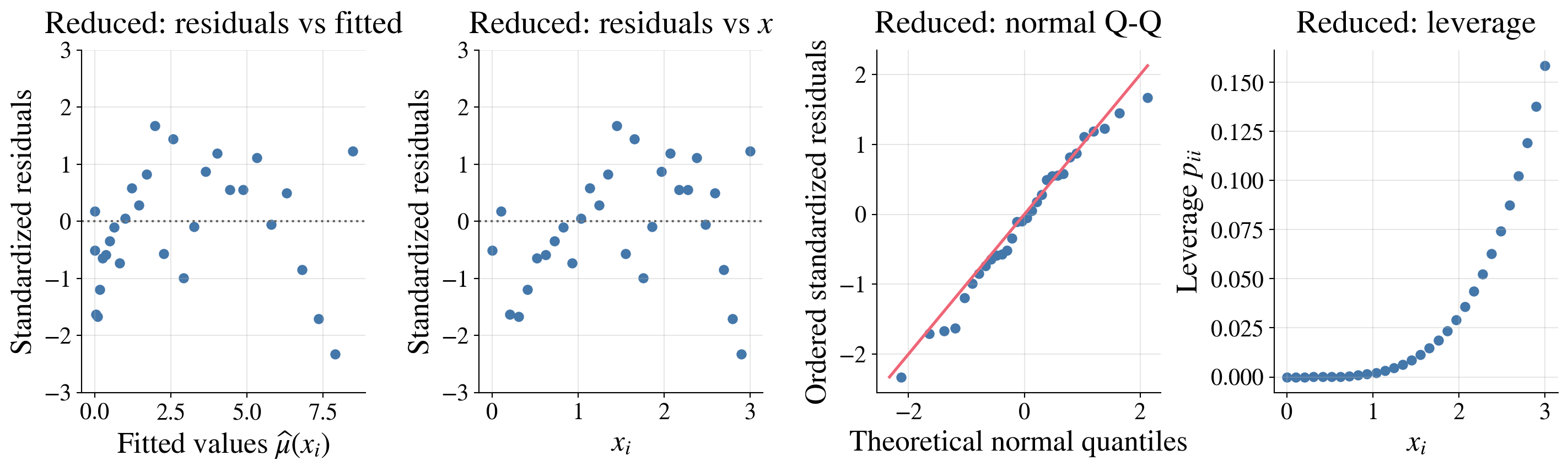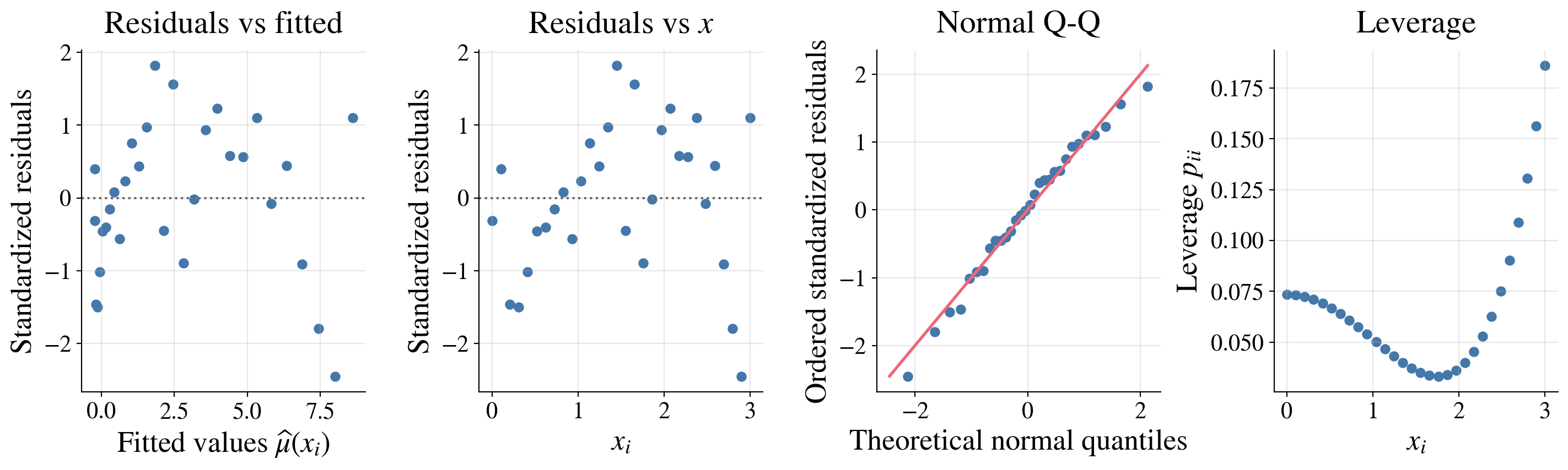 | Point estimators | \(\hbeta = (\mX^\top \mX)^{-1} \mX^\top \vY\), \(\hvY = \mX \hbeta\) | \(\barY\), \(S^2\), \(\hlambda_{\MLE}\), \(\hp_{\MLE}\), … |