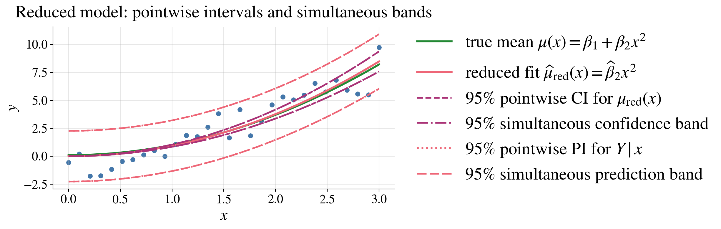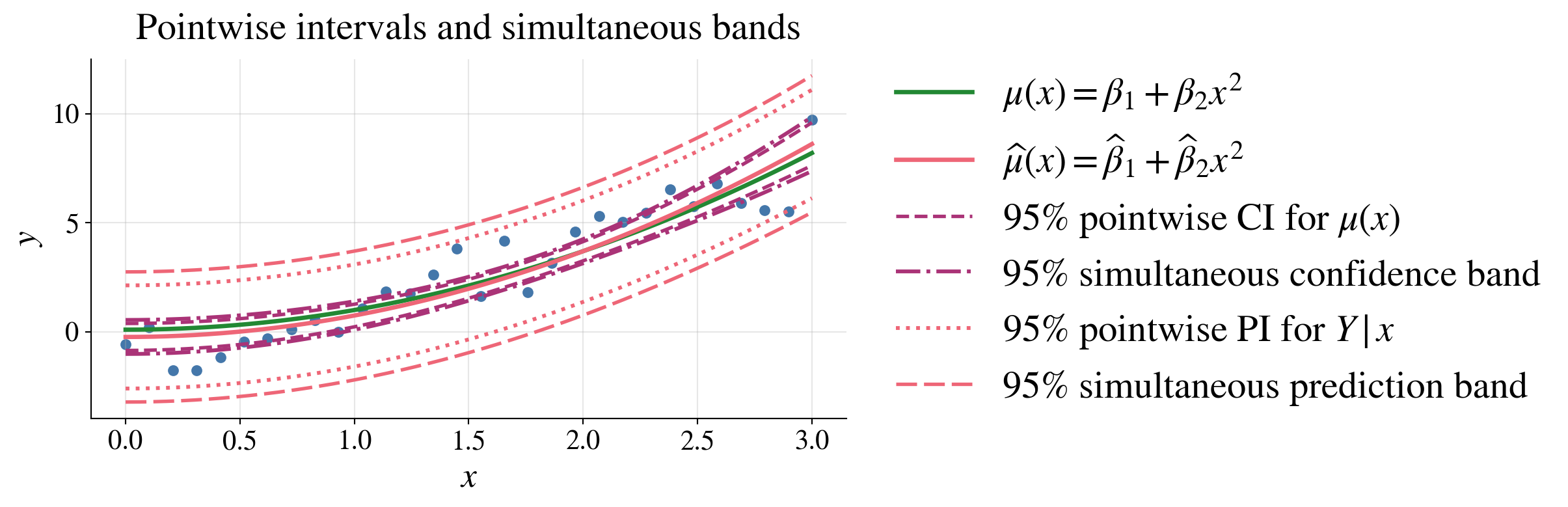 Simultaneous bands are wider than pointwise intervals because they must cover \(\vx\) values at once, not just one fixed \(\vx\)